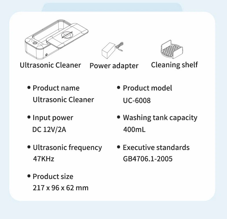 UC-6008 là thiết bị làm sạch kính mắt, trang sức bằng sóng siêu âm, thiết kế nhò gọn có thể mang theo người. Sản phẩm được sản xuất bởi hãng Jiayuanda - Trung Quốc, nhập khẩu và phân phối chính hãng bởi Wico.