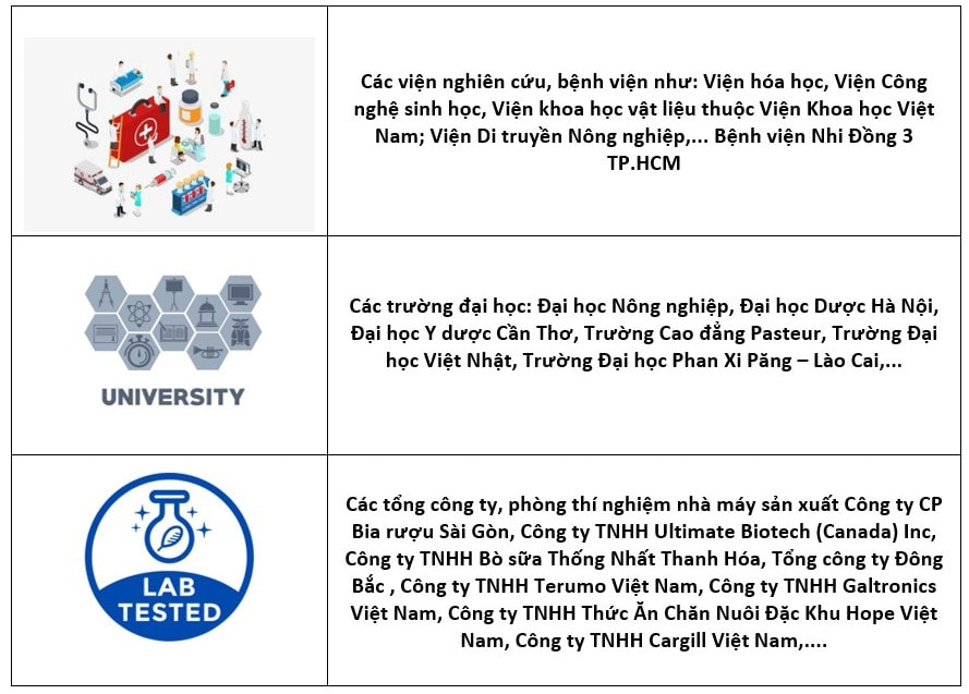 Không chỉ vậy, WICO còn là nhà cung cấp các thiết bị, vật tư, hoá chất phòng thí nghiệm thường xuyên và lâu dài cho các Viện nghiên cứu, các trường đại học cũng như phòng lab của các nhà máy trong nhiều lĩnh vực. Trong đó có những đối tác lớn của WICO như: Bệnh viện Bạch Mai, Bệnh viện đa khoa Tâm Anh, Công ty cổ phần thức ăn chăn nuôi C.P Việt Nam, Công ty TNHH Cargill Việt Nam, Công ty TNHH nước giải khát Suntory Pépico Việt Nam, Công ty cổ phần Bia - Rượu - Nước giải khát Hà Nội, Công ty cổ phần Bia - Rượu - Nước giải khát Sài Gòn, Công ty Samsung Display Việt Nam, Công ty TNHH thực phẩm Orion Vina tại Bắc Ninh...