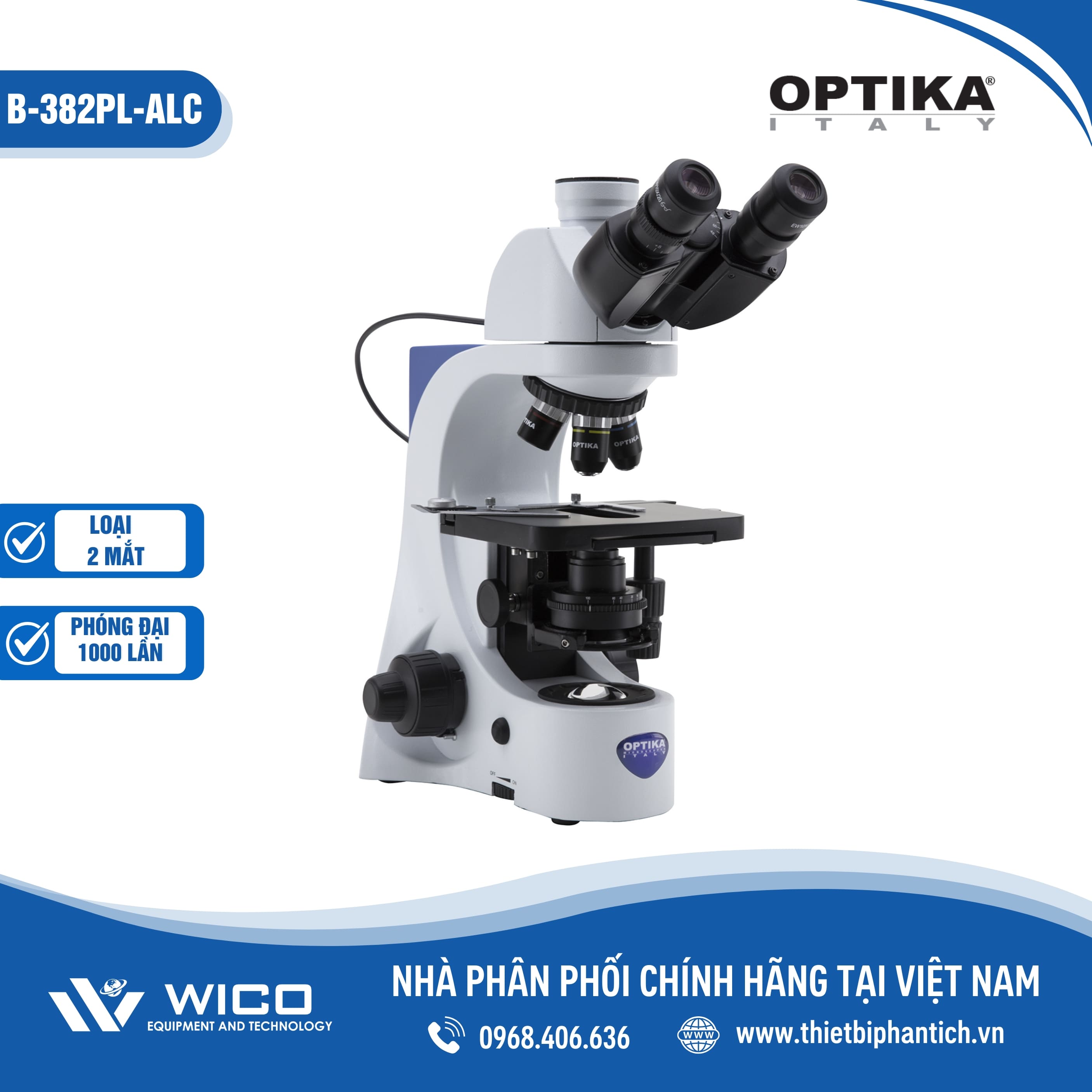 - Kính hiển vi B-382PL-ALC là loại kính hiển vi sinh học 2 mắt, với độ phóng đại tối đa 1000 lần do hãng Optika sản xuất, được nhập khẩu chính hãng bởi công ty Wico. Kính được sử dụng rộng rãi trong lĩnh vực y tế, giáo dục và phòng thí nghiệm.